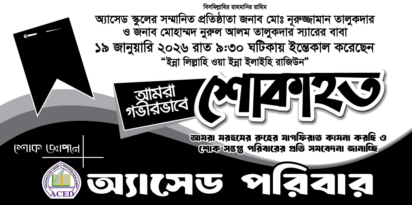 অ্যাসেড স্কুলের সম্মানিত প্রতিষ্ঠাতা জনাব মোঃ নূরুজ্জামান তালুকদার ও জনাব মোহাম্মদ নুরুল আলম তালুকদার স্যারের আব্বা অদ্য ১৯ জানুয়ারি ২০২৬ রাত ৯:৩০ ঘটিকায় ইন্তেকাল করেছেন। ইন্নালিল্লাহি ওয়া ইন্না ইলাইহি রাজিউন। আমরা গভীরভাবে শোকাহত ও তাঁর আত্মার মাগফেরাত কামনা করছি। আগামীকাল ২০ জানুয়ারি ২০২৬ অ্যাসেড স্কুলের সকল ক্যাম্পাসের ক্লাস সহ সকল কার্যক্রম বন্ধ থাকবে। মরহুমের নামাজের জানাজা আগামীকাল বাদ জোহর (নামাজ ১:১৫) ব্যাংক কলোনী মাদ্রাসা মসজিদে অনুষ্ঠিত হবে। সকলকে মরহুমের জন্য দোয়া ও জানাজায় অংশগ্রহণের জন্য অনুরোধ করা হল।